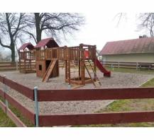 Krásná velká sestava se skluzavkou, dvěma lezecími stěnami, jedna kolmá je lezecí síť a druhá je plošina s lezecími kameny. Tělo sestavy je tvořené dvěma věžemi spojenými houpací lávkou. Dále se mohou děti houpat na houpačkovém přístavku se dvěma houpačkami, který je nedílnou součástí této sestavy. Za malý příplatek vám vyměníme houpačkový sedák za jinou houpačku např. houpačkový sedák pro malé děti nebo houpačkové sedáky jiné barvy. Tato úžasná velká sestava poskytne mnoho příležitostí ke hře dětí od 3 do 12 let. Výška podlahy herní sestavy je 1,5m od země a proto je nutné v celé dopadové ploše vytvořit povrch tlumící pád z této výšky ( 30cm silná vrstva písku, kačírku nebo drcené kůry).