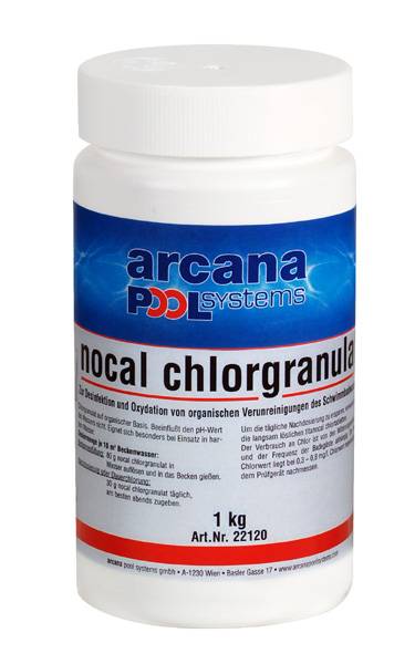Chlorový granulát Nocal je na organické bázi. Neovlivňuje pH hodnotu vody a je vhodný obzvlášť při tvrdé vodě. Hodnotu chloru je nutno pravidelně kontrolovat. Ideální obsah chloru se pohybuje mezi 0,3 – 0,8 mg/l.