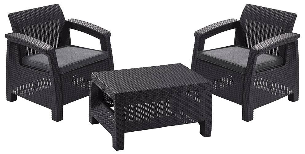 Souprava Corfu WEEKEND je menšímoderníposezení jak do zahrady, na terasy či do interiéru. Souprava je vyrobena z lisovaného plastu v imitaci přírodního ratanu. Set je doplněn o podušky, které zajistí ještě větší pohodlí. Jedná se o velmi oblíbenou soupravu. Skládá se ze dvou křesílek a stolku. Jednoduchá montáž i údržba.