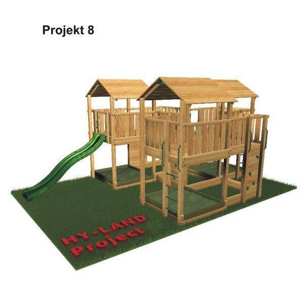 Sestava šesti věží se skluzavkou, která má jako nástupní plošinu třikrát šplhací stěnu opatřenou lezeckými kameny nebo třikrát klasický žebříček. Součástí sestavy je plastová skluzavka, kterou dodáváme jen v zelené barvě a je dlouhá 3 m, stálobarevný plast mrazuvzdorný, tato skluzavka je pevnější než standartně prodávané skluzavky pro privátní účely.