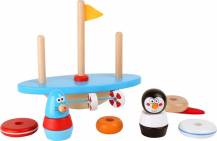 Tučňák a přátelé se připravují na dlouhou cestu na této motorické tréninkové lodi. Záchranné kruhy jsou umístěny na boční straně a mohou se pohybovat sem a tam. Plachetní stožár drží dřevěné kruhy různých velikostí a plstěné plachty. Dřevěné kusy se snadno drží a trénují dětskou motoriku.
