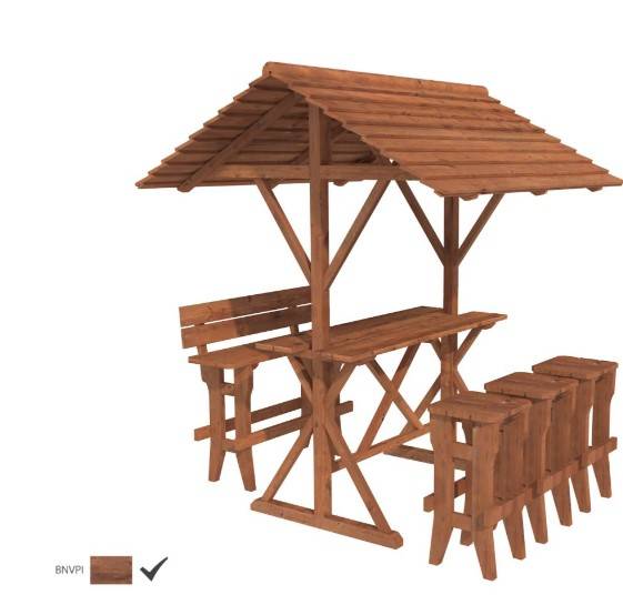 Vaší pozornosti by neměl uniknout dřevěný zahradní párty stůl s lavicí, židlemi a stříškou PALMAKO LEO.