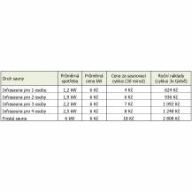 Infrasauny jsou energeticky nenáročné spotřebiče , náklady na energii se pohybují v závislosti na velikosti infrasauny pro každý Váš pobyt v infrasauně okolo 4 - 8 Kč. Záleží na velikosti a kapacitě infrasauny, čím větší infrasauna, tím vyšší výkon potřebuje. Níže naleznete tabulku uvádějící průměrnou spotřebu a přibližnou cenu za saunovací cyklus daného typu infrasauny.