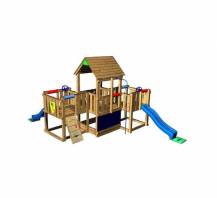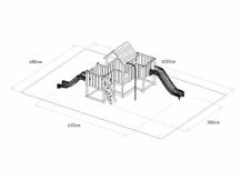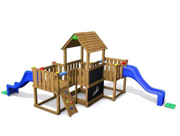 Sestava obsahuje – 1x věž se střechou, 2x věž bez střechy, 2x lezecí stěna, 2x kreslící tabule, 4x bezpečnostní polštářek.