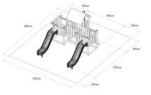 Moc pěkná herní sestava s dvěma kvalitními laminátovými skluzavkami vhodná pro mateřské školy, obce a restaurace. Dětské hřiště velmi dobře podpoří pohybovou aktivitu dětí a díky herním prvkům, jako jsou lezecí stěny, požární tyč a dva volanty, bude o zábavu postaráno na dlouhý čas. Dětské hřiště je určeno pro děti od 3 do 14 let, na děti od 3 do 6 let je nutný dohled dospělé osoby.