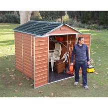 Skylight 6x8 hnědý - zahradní domek • ŠPIČKOVÝ POLYKARBONÁT S UV OCHRANOU OD SPOLEČNOSTI PALRAM • OSVĚTLENÝ INTERIÉR DÍKY NOVÉ TECHNOLOGII STŘECHY PROPOUŠTĚJÍCÍ SVĚTLO • PEVNÝ HLINÍKOVÝ RÁM NEPODLÉHAJÍCÍ KOROZI • PROTISKLUZOVÁ PODLAHA SOUČÁSTÍ DODÁVKY • SNADNÉ SESTAVENÍ A MONTÁŽ • ZÁRUKA 10 LET! • Nová řada roku 2014 s novým, robustním hliníkovým rámem a vylepšeným designem. Špičkově zpracované a nesmírně odolné zahradní domky Skylight z polykarbonátu nejvyšší kvality a se střechou ze speciálního polykarbonátu, který propouští sluneční světlo do interiéru domku. Ideální na uložení zahradního náčiní, sportovního vybavení, grilovacích potřeb nebo zahradního nábytku. Výběr materiálu u zahradního domku je naprosto zásadní. Plechové domky či levné plastové domky z polyethylenu mají mnoho nepříjemných vlastností, které zkracují jejich životnost. Ať už je to rez nebo křehnutí plastu, špatná odolnost těchto materiálů vůči hrubšímu zacházení, horší odolnost proti sněhové nadílce či kroupám. Nejmodernějším materiálem dnes je polykarbonát, který žádnou z těchto nectností netrpí. Musí to být ovšem kvalitní polykarbonát s dokonalou UV ochranou. Takový, který vyrábí například společnost PALRAM a který se světoví architekti nebojí používat na těch nejzajímavějších stavbách dneška. Více na http://www.palram.com/Profile_Video . Chcete-li se po mnoho let těšit z opravdu kvalitního výrobku a využít veškeré technické know-how lídra na trhu, doporučujeme Vám zvolit zahradní domek od společnosti Palram. Výhody: • Prakticky nerozbitné stěny i střecha z polykarbonátu s UV ochranou. Na rozdíl od běžných plastových domků z polyethylenu PE nikdy nezkřehnou a bez problémů odolají změnám teplot, přívalům sněhu nebo krupobití. Oproti plechovým domkům nikdy nereznou a stěnu nelze prakticky promáčknout či jinak poškodit. Není je potřeba ani natírat, či se bát plísně a hniloby jako u dřevěných domků. • Unikátní systém snadného nasunutí polykarbonátových panelů do hliníkových profilů • Nerezová konstrukce ze silných hliníkových profilů • Unikátní střecha z polykarbonátu propouštějícího světlo prosvětluje domek zevnitř • Vysoká nosnost střechy 75 kg/m2 • Bezúdržbové a snadno omyvatelné. Žádné starosti z nátěrem, hnilobou či rzí. • Zamykatelné, lehce otvíratelné, široké dvoukřídlé dveře v hliníkovém rámu • Účinná ventilace na obou stranách štítu • Protiskluzová podlaha s možností ukotvení je součástí dodávky • Snížený nájezd usnadní manipulaci s kolečkem či travní sekačkou • Možno zvolit i v moderní šedé barvě (obj. č. 702302) Snadná manipulace: • Dodávka v lehkém jednotném balení • Ideální pro objednání přes e-obchod • Minimální nároky na skladování v nesloženém stavu • Přehledný návod, jednoduché sestavení ve 2 osobách • Hotový domek může být snadno přemístěn na jiné místo Velmi dlouhá životnost a odolnost: • Prakticky nerozbitné polykarbonátové panely • Robustní hliníková konstrukce, která nikdy nezrezne • Vynikající odolnost proti všem vlivům počasí • 100% UV ochrana polykarbonátových panelů • Bez nároků na údržbu • Možnost ukotvení k zemi Snadná montáž a minimální potřeba servisu: • Pro zajištění stability výrobce doporučuje ukotvení pomoci kotvícího systému! • Unikátní systém zasouvání panelů bez nutnosti dalších zajišťovacích prvků • Přehledný návod, který Vás krok po kroku provede montáží • Konstrukční prvky domků Palram jsou jednotné, proto nikdy není problém s náhradními díly ani po mnoha letech • Protiskluzová podlaha s možností ukotvení je součástí dodávky • Snížený nájezd usnadní manipulaci s kolečkem či travní sekačkou • Možno zvolit i v moderní šedé barvě (obj. č. 702302)