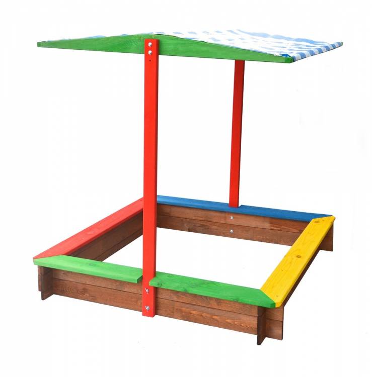 Dětské dřevěné pískoviště se stříškou v barevném provedení.