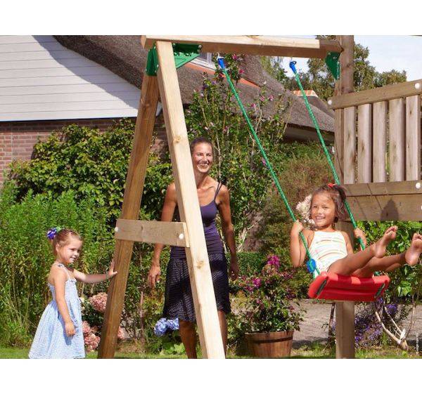Přídavný modul Jungle Gym Swing s jednou houpačkou Vaše hřiště rizšíří o ještě více zábavy na hřišti. Modul je vyroben z lepených mimostředových hranolů s povrchovou úpravou - hnědá impregnace. Modul se skládá z krabice a dřeva. Hřiště je certifikované s normou EN 71 pro privátní použití.
