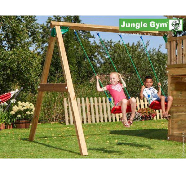 Přídavný modul Jungle Gym Swing s dvěma houpačkami Vaše hřiště rizšíří o ještě více zábavy na hřišti. Modul je vyroben z lepených mimostředových hranolů s povrchovou úpravou - hnědá impregnace. Modul se skládá z krabice a dřeva. Hřiště je certifikované s normou EN 71 pro privátní použití.