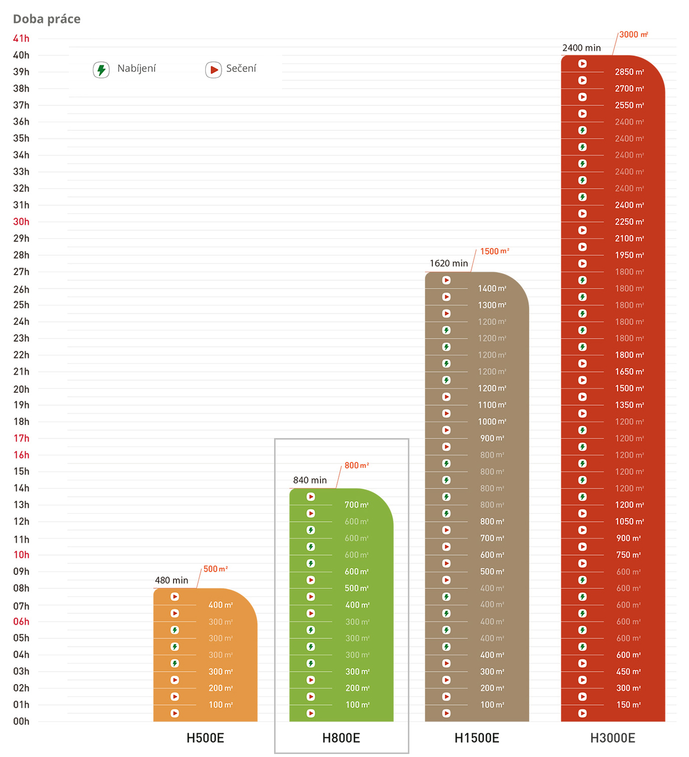 Doba nabíjení, hodinový výkon a efektivita práce se u jednotlivých modelů liší. Podle následující tabulky si vyberte vhodný model podle velikosti vašeho trávníku. Model H500E dokáže posekat trávník o ploše 500 m2 za přibližně 8 hodin.