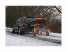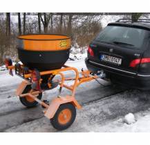 Tažené rotační rozmetadlo, kapacita zásobníku 250 kg soli, pracovní šířka 3-6m. Převodovka s ocelovými kuželovými koly.