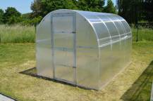 Hliníkový skleník, š 3,87 x d 2,01 m, stříbrná barva, 2x stř. okno, polykarbonát 6 mm, plocha 7,79 m2.