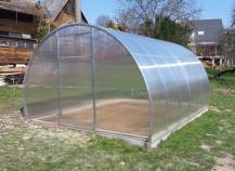 Hliníkový skleník, š 2,57 x d 4,45 m, stříbrná barva, 4x stř. okno, polykarbonát 4 mm, plocha 11,44 m2.