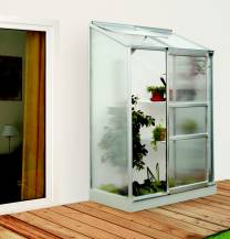 Hliníkový skleník ke stěně, š 1,31 x d 0,69 m, stříbrná barva, 1x stř. okno, polykarbonát 4 mm, plocha 0,9 m2.