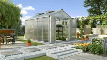 Hliníkový skleník, š 1,93 x d 2,57 m, stříbrná barva, 1x stř. okno, polykarbonát 4 mm, základna v ceně, plocha 4,96 m2.