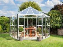 Hliníkový šestistěnný pavilon, průměr 3,20-3,80 m, stříbrná barva, kalené sklo 3 mm + střecha z polykarbonátu 6 mm.