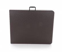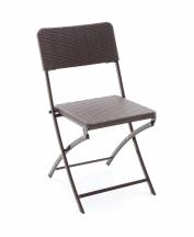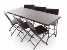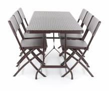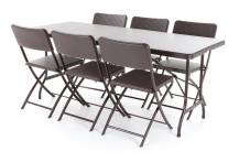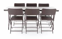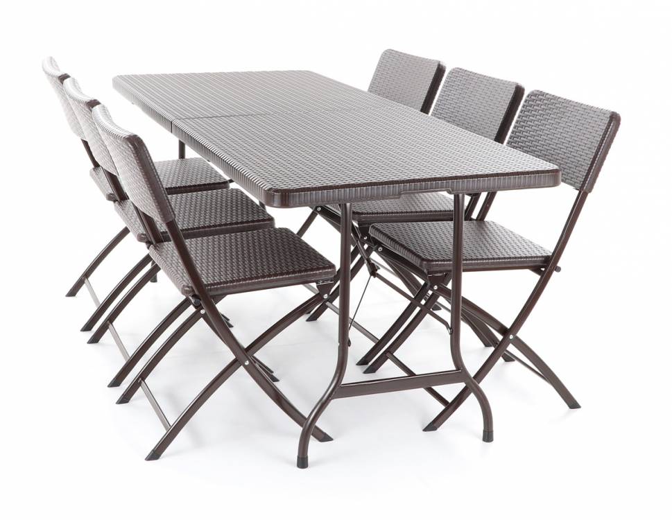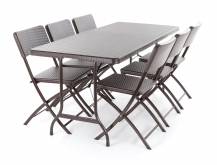 Stolová sestava 6-ti skládacích židlí z ocelových profilů povrchově dokončena komaxitovou barvou, čalounění je v imitaci umělého ratanu z lisovaného plastu s UV filtrem, určená do interiérů, exteriérů a pergolových prostor.