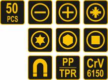 Sada 50ks šroubováků vyrobených z CrV6150 oceli s ergonomicky tvarovanými rukojeťmi z protikluzného PP a TPR.